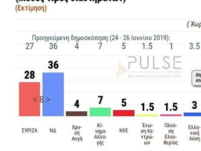 Η ΝΔ λαμβάνει το 36% στην πρόθεση ψήφου με αναγωγή επί των εγκύρων, ποσοστό αμετάβλητο σε σχέση με την προηγούμενη μέτρηση. Ο ΣΥΡΙΖΑ ακολουθεί με 28%, βελτιώνοντας όμως την επίδοσή του κατά μία μονάδα και συνεπώς μειώνοντας ισόποσα την διαφορά.