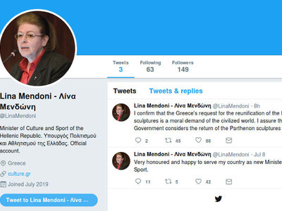 Δεν διαθέτει λογαριασμό σε κοινωνικά δίκτυα η νέα υπουργός Πολιτισμού και Αθλητισμού Λίνα Μενδώνη, σύμφωνα με δημοσιογραφικές πληροφορίες. Νωρίτερα, σήμερα, λογαριασμός στο τουίτερ με το όνομα και τη φωτογραφία της υπουργού, την έφερε να δηλώνει ότι είναι ζωτικής σημασίας η επιστροφή των μαρμάρων του Παρθενώνα, η οποία αναπαράχθηκε από διεθνείς επιτροπές υποστήριξης του σχετικού ελληνικού αιτήματος. Η πρώτη ανάρτηση του λογαριασμού είχε ημερομηνία 8 Ιουλίου ενώ είχε πλέον των 150 ακολούθων.