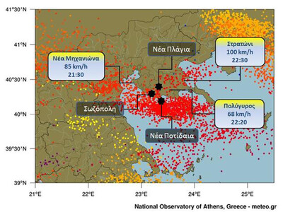 Όπως παρουσιάζει σε ειδικό χάρτη το meteo.gr, η περιοχή «βομβαρδίστηκε» από κεραυνούς μέσα σε λίγη ώρα. Μάλιστα εντυπωσιακό είναι το γεγονός πως οι κεραυνοί σημειώνονται με κόκκινες κουκίδες, και τα δύο πόδια της Χαλκιδικής έχουν κυριολεκτικά… εξαφανιστεί μέσα στο κόκκινο!