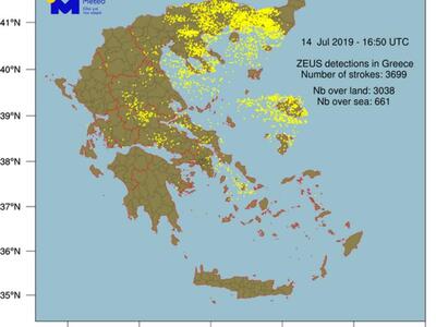 Παράλληλα, το σύστημα εντοπισμού κεραυνών του Εθνικού Αστεροσκοπείου Αθηνών «ΖΕΥΣ» κατέγραψε περισσότερους από 3.500 κεραυνούς, η γεωγραφική κατανομή των οποίων φαίνεται στο χάρτη που ακολουθεί.