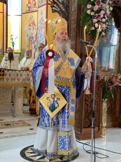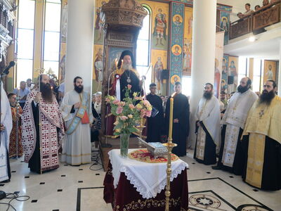 Ἀνήμερα, την Τετάρτη 17.7.2019, στὸν κατάμεστο ἀπὸ πιστοὺς Ἱερὸ Ναό, ἐτελέσθη ἡ Θεία Λειτουργία χοροστατούντος του Θεοφιλεστάτου Ἐπισκόπου Κερνίτσης κ. Χρυσάνθου, ὁ ὁποῖος κήρυξε τόν θεῖο λόγο & αναφέρθηκε στὸ μαρτύριο τῆς Ἁγίας Μαρίνης καὶ στὴν ἀγάπη της γιὰ τὸν Νυμφίο Χριστό.