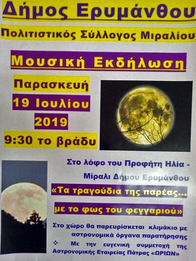 Έχει καθιερωθεί τα τελευταία χρόνια κάθε καλοκαίρι να πραγματοποιείται στο Μίραλι του Δήμου Ερυμάνθου πολιτιστική εκδήλωση συνδυασμένη με αστροπαρατήρηση και πάντα έχει επιτυχία. Έτσι και φέτος, έχει προγραμματιστεί μία μουσική εκδήλωση με τίτλο «Φεγγαράδα» που την διοργανώνει ο Πολιτιστικός Σύλλογος Μιραλίου απόψε Παρασκευή 19 Ιουλίου 2019 μετά στις 21.30 στο λόφο του Προφήτη Ηλία της τοπικής κοινότητας στο Μίραλι του Δήμου Ερυμάνθου. Στο χώρο όπως αναφέρει και η σχετική αφίσα, θα βρίσκεται κλιμάκιο και της Αστρονομικής Εταιρείας Πάτρας «Ωρίων» με αστρονομικά όργανα παρατήρησης για όποιο θελήσει να ατενίσει τον έναστρο ουρανό τη νύχτα.