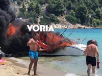 Σημειώνεται ότι το σκηνικό εκτυλίχθηκε μπροστά στα μάτια εκατοντάδων λουόμενων, λίγα μέτρα μόλις από την παραλία.Το σκάφος τυλίχθηκε στις φλόγες και κάηκε ολοσχερώς. Στο σημείο έσπευσε και κλιμάκιο της Πυροσβεστικής Θεσσαλονίκης, ωστόσο η φωτιά είχε σβήσει προ αφίξεως.