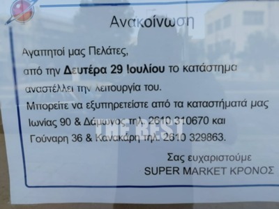 Τέλος εποχής για το super market Κρόνος στα Ταμπάχανα το οποίο λειτουργούσε από το 1980. Το κατάστημα όπως μπορείτε να δείτε και στις ακόλουθες φωτογραφίες έχει κατεβάσει "ρολά" και ενημερώνει τους καταναλωτές πως από σήμερα Δευτέρα 29 Ιουλίου αναστέλλει τη λειτουργία του. Το κατάστημα πια έχει περάσει 100% στα χέρια του Σκλαβενίτη, αναφέρει στο thebest.gr ο πρώην ιδιοκτήτης του καταστήματος Νίκος Καρακίτσος. Πρόκειται για αναδιάρθρωση δεδομένου ότι λίγο πιο πάνω, στην οδό Αρόης, λειτουργεί ένα μεγαλύτερο super market Σκλαβενίτης. Ο Νίκος Καρακίτσος αναφέρει πως οι 6 υπάλληλοι που εργάζονταν θα απορροφηθούν σε άλλα καταστήματα και δηλώνει στο thebest.gr.