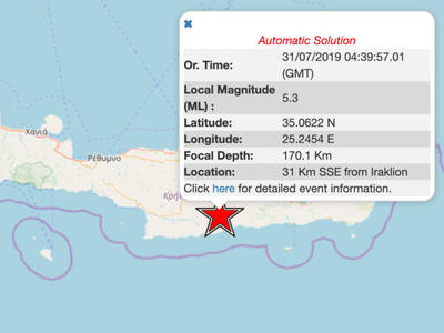 Σεισμός 5,3 Ρίχτερ, σύμφωνα με την αυτόματη λύση του Γεωδυναμικού Ινστιτούτου στην Κρήτη. Σημειώθηκε νωρίς το πρωί της Τετάρτης. Το επίκεντρο προσδιορίζεται 35 χιλιόμετρα ΝΔ του Ηρακελίου κοντά στα Ανώγεια. Σύμφωνα με το Ευρωμεσογειακό Σεισμολογικό Κέντρο ο σεισμός ήταν της τάξεως των 5 ρίχτερ. Είχε εστιακό βάθος 89 χλμ και το επίκεντρο ήταν 5 χλμ ΝΔ του Τηλισού.