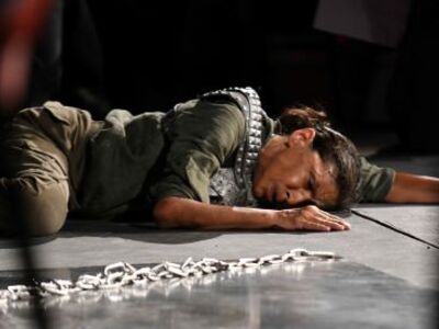 Όσο για την πιο συγκλονιστική σκηνή, μακράν είναι αυτή που η Χάντερ – Προμηθέας προσπαθεί να πιει νερό από έναν κουβά, το νερό χύνεται και η ίδια σέρνεται στο έδαφος και σχεδόν «γλείφει» το νερό. Μοναδική, όπως και εκεί όπου στέκεται αλυσοδέσμια και υψώνει την γροθιά της, μία κίνηση με καθαρά πολιτικό χαρακτήρα & συνάμα ένα πολιτικό σχόλιο μέσω της παράστασης.