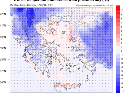 Η θερμοκρασία θα παρουσιάσει πτώση ως προς τις μέγιστες τιμές και ο παρακάτω χάρτης δείχνει την μεταβολή των μεγίστων θερμοκρασιών την Πέμπτη 15/08 σε σχέση με τις αντίστοιχες την Τετάρτη 14/08. Η πτώση της θερμοκρασίας θα γίνει αισθητή κυρίως στη Δυτική Μακεδονία και την Ήπειρο (Χάρτης 2), όμως στα νότια ηπειρωτικά, στη Δυτική Στερεά, τη Θεσσαλία και την Ανατολική Θράκη ο υδράργυρος θα ξεπεράσει και πάλι τοπικά τους 35°C με αυξημένα επίπεδα δυσφορίας. Και σε αυτές τις περιοχές η πτώση της θερμοκρασίας θα γίνει αισθητή από την Παρασκευή 16/08. Οι άνεμοι στο Αιγαίο θα πνέουν από μεταβλητές διευθύνσεις μέτριοι έως ισχυροί 4-6 μποφόρ και στο Ιόνιο βορειοδυτικοί έως θυελλώδεις 7 μποφόρ. Θα πρέπει να σημειώσουμε ότι και στη Βόρεια Ελλάδα τοπικά οι καταιγίδες θα προκαλέσουν ισχυρούς έως θυελλώδεις ανέμους.