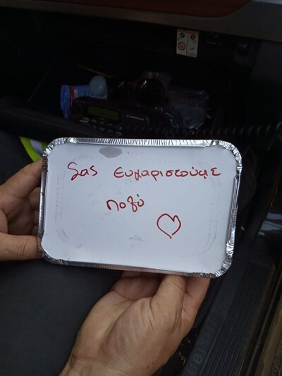 Σήμερα το πακέτο φαγητού που προσφέρθηκε στον Πατρινό Υπαρχηγό του Πυροσβεστικού Σώματος Κώστα Κυριακόπουλο που βρίσκεται εδώ και μέρες στην Εύβοια, έγραφε: Σας ευχαριστούμε πολύ.