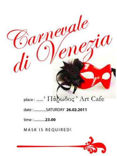 Ένα καρναβαλικό πάρτυ με τίτλο "Carnevale di Venezia" θα πραγματοποιηθεί στο Art Cafe "Πάρωδος" το Σάββατο 26 Φεβρουαρίου. Το πάρτυ θα ξεκινήσει μετά τις 23:00 και αναμένεται να γίνει πανικός!!