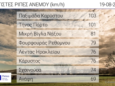Έκτακτο δελτίο θυελλωδών ανέμων εξέδωσε για σήμερα Δευτέρα, 19 Αυγούστου, η Εθνική Μετεωρολογική Υπηρεσία.Όπως αναφέρει η ΕΜΥ, κατά τη διάρκεια της μέρας, οι άνεμοι θα είναι πολύ ισχυροί, βόρειας και βορειοδυτικής διευθύνσεως και τοπικά θυελλώδεις σε μεγάλα τμήματα του Αιγαίου, εντάσεως 7 με 8 μποφόρ.