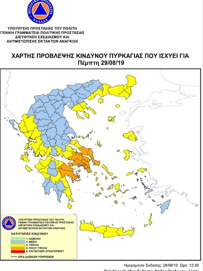 Σύμφωνα με πρόβλεψη της Γενικής Γραμματείας Πολιτικής Προστασίας οι Περιφερειακές Ενότητες Αιτωλοακαρνανίας, Αχαΐας και Ηλείας θα βρίσκονται στην κατηγορία κινδύνου 3 (υψηλή), αύριο Πέμπτη 29 Αυγούστου 2019, όπως φαίνεται στον επισυναπτόμενο ημερήσιο Χάρτη Πρόβλεψης Κινδύνου Πυρκαγιάς.