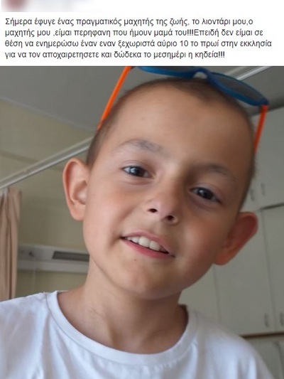 «Σήμερα έφυγε ένας πραγματικός μαχητής της ζωής, το λιοντάρι μου, ο μαχητής μου, είμαι περήφανη που ήμουν μαμά του! Επειδή δεν είμαι σε θέση να ενημερώσω έναν έναν ξεχωριστά αύριο 10 το πρωί στην εκκλησία για να τον αποχαιρετίσετε και δώδεκα το μεσημέρι η κηδεία!» έγραψε συντετριμμένη στο Facebook η μητέρα του.