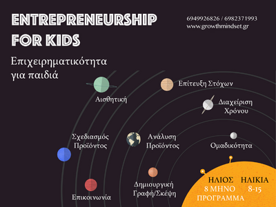 Για τρίτη συνεχόμενη χρονιά, η Growth Mindset πραγματοποιεί το οχτάμηνο πρόγραμμα «Entrepreneurship for Kids» που απευθύνεται σε παιδιά 8-15 ετών. Το πρόγραμμα διαρθρώνεται μέσα από τρεις βασικούς άξονες, όπου τα παιδιά έρχονται σε επαφή με την ιδέα της επιχειρηματικότητας μέσα από παιχνίδια, γρίφους και πραγματικές επιχειρηματικές υποθέσεις προκειμένου να φτιάξουν το δικό τους προϊόν. Οι βασικοί πυλώνες της ομαδικότητας, της διαχείρισης χρόνου και της επικοινωνίας μπλέκονται αρμονικά με αυτούς της στοχοθεσίας, της αξιολόγησης του προϊόντος και του σχεδιασμού. Οι εκπαιδευτές και τα παιδιά γίνονται μια ομάδα και το ταξίδι της γνώσης ξεκινά!