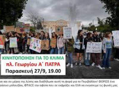 Με κεντρικό σύνθημα "αλλάξτε πολιτική, όχι το κλίμα, δεν υπάρχει λεπτό για χάσιμο" γίνεται αυτή την ώρα στην πλατεία Γεωργόυ της Πάτρας, συκέντρωση για το κλίμα.