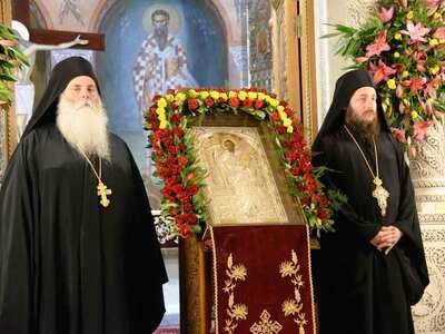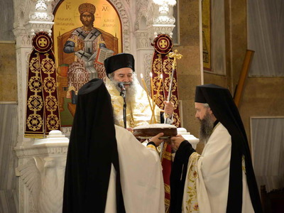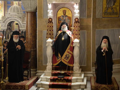 Στόν πανηγυρικό Ἑσπερινό ἐχοροστάτησε ὁ Σεβασμιώτατος Μητροπολίτης Μάνης κ. Χρυσόστομος, συγχοροστατούντων τῶν Σεβασμιωτάτων Μητροπολιτῶν: Ἀρκαλοχωρίου, Καστελίου καί Βιάννου κ. Ἀνδρέου (Ἐκκλησία τῆς Κρήτης), Κανάγκας κ. Θεοδοσίου (Πατριαρχεῖο Ἀλεξανδρείας), καί τῶν Θεοφιλεστάτων Ἐπισκόπων, Τολιάρας καί Νοτίου Μαδαγασκάρης κ. Προδρόμου (Πατριαρχεῖο Ἀλεξανδρείας), Κερνίτσης κ. Χρυσάνθου καί τοῦ Σεβασμιωτάτου Μητροπολίτου Πατρῶν κ.κ. Χρυσοστόμου.