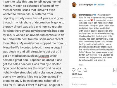 Γράφει χαρακτηριστικά: «Θέλω να μιλήσω για την ψυχική υγεία. Έχω νιώσει τόση ντροπή για τα ψυχικά μου ζητήματα που δεν ήθελα καν να μιλήσω σε φίλους. Πάσχω από αγχώδη διαταραχή από τότε που ήμουν 4 ετών και κάνω ψυχοθεραπεία από παιδί...