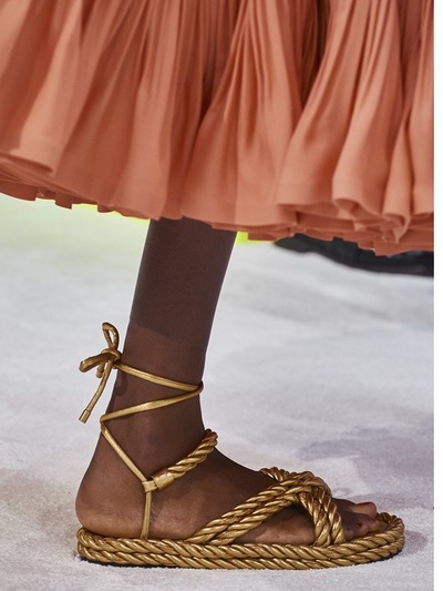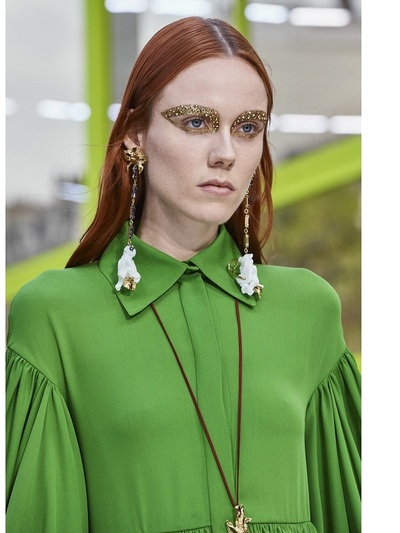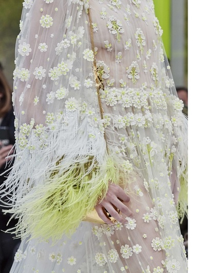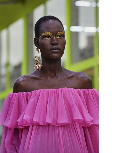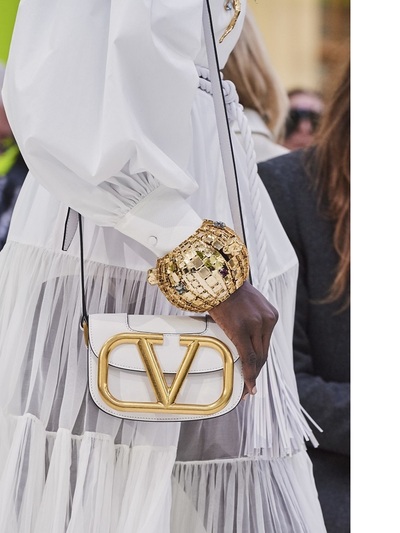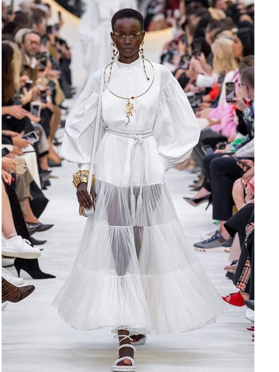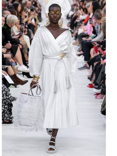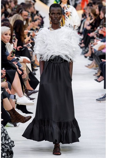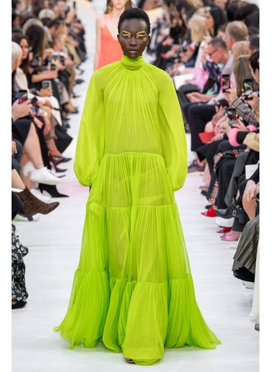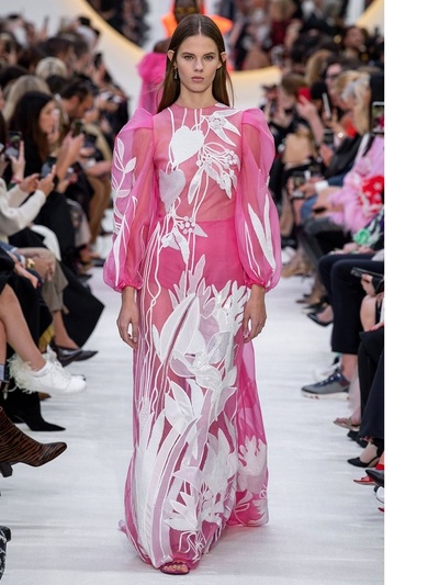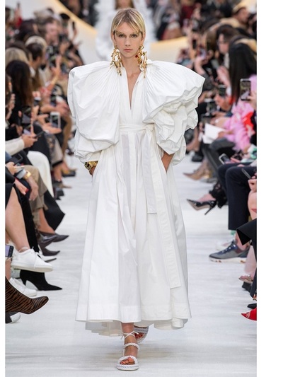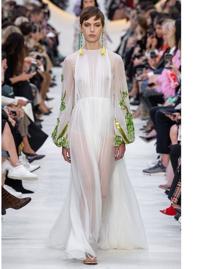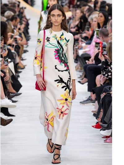 Ωδή στην ομορφιά ήταν το Valentino Show Spring- Summer 2020 στο Παρίσι, καθώς ο Pier Paolo Piccioli αποδεικνύεται ο ιδανικός διάδοχος του ιδρυτή του οίκου, όσο αφορά στη φιλοσοφία ανάδειξης της θηλυκότητας με τα πιο φίνα και πολυτελή υλικά αλλά και το διάκοσμο που «φωνάζει» couture. Eντυπωσιακές φόρμες ρούχων γεμάτες πλούσιες πτυχές, βολάν, φτερά, κεντήματα, κοσμήματα σε κίτρινο χρυσό σαν γλυπτά και μακιγιάζ με κρύσταλλα μάγεψαν το κοινό. Η μονοχρωμία του λευκού, του λάιμ, του κόκκινου, τα άνθινα prints της vintage αίγλης αλλά και των πινάκων του Γκογκέν, ανέδειξαν γραμμές ρευστές και ογκώδεις που υπαινίσσονται τη σιλουέτα. Με μούσα την εξωτική Adut Akesh, πρέσβειρα του νέου αρώματος «Born» του oίκου και η πρώτη μαύρη supermodel σε αυτό το ρόλο, ο Piccioli συνεχίζει να εμπνέεται από τη λογοτεχνία, τα εικαστικά και τα δικά του, ονειρικά seventies.