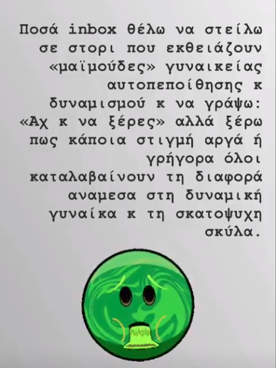 «Πόσα inbox θέλω να στείλω σε στόρι που εκθειάζουν "μαϊμούδες" γυναικείας αυτοπεποίθησης και δυναμισμού και να γράψω: "Αν και να ξερες", αλλά ξέρω πως κάποια στιγμή αργά ή γρήγορα όλοι καταλαβαίνουν τη διαφορά ανάμεσα στη δυναμική και τη σκατόψυχη σκύλα» έγραψε η Ελεονώρα Μελέτη στο InstaStory και ο συνόδευσε με ένα emoticon που... κάνει εμετό.