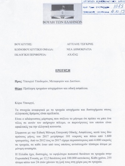 το πλαίσιο του κοινοβουλευτικού ελέγχου, ο βουλευτής Αχαΐας της ΝΔ Άγγελος Τσιγκρής κατέθεσε ερώτηση προς τον Υπουργό Μεταφορών, με αφορμή τα πρόσφατα θανατηφόρα τροχαία δυστυχήματα στις Καμάρες Αχαΐας και το Ζευγολατιό Κορινθίας, με θύματα αθώους συμπολίτες μας.
