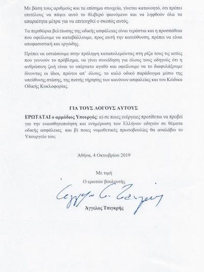 Συγκεκριμένα, ο Άγγελος Τσιγκρής ρωτά τον Υπουργό Μεταφορών: α) σε ποιες ενέργειες προτίθεται να προβεί για την ευαισθητοποίηση και ενημέρωση των Ελλήνων οδηγών σε θέματα οδικής ασφάλειας και β) ποιες νομοθετικές πρωτοβουλίες θα αναλάβει το Υπουργείο του;