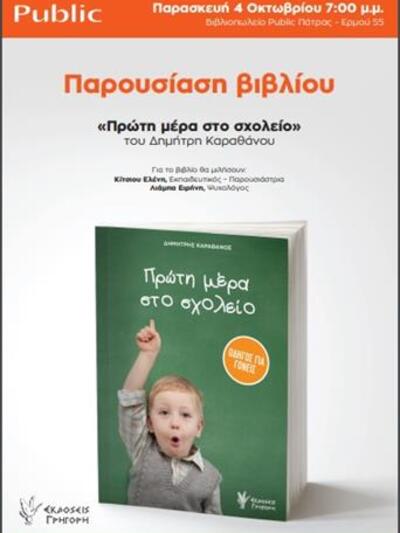 Απόψε Παρασκευή 4 Οκτωβρίου 2019, στις 7 το απόγευμα, παρουσιάζεται στο Public της Πάτρας στην οδό Ερμού 55, με ελεύθερη είσοδο για το κοινό, το βιβλίο «Πρώτη μέρα στο σχολείο» του Δημήτρη Καραθάνου που κυκλοφορεί από τις εκδόσεις Γρηγόρη σας προσκαλούν στην παρουσίαση, στο Public Βόλου, την Παρασκευή 4 Οκτωβρίου, στις 19.00 το απόγευμα.