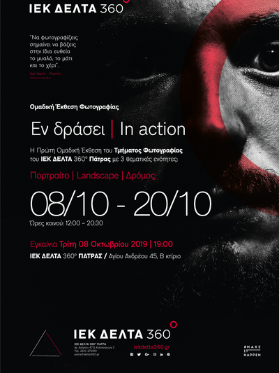 Η πρώτη Ομαδική Έκθεση Φωτογραφίας με τίτλο Εν δράσει/In action, που φιλοτέχνησαν οι σπουδαστές της ειδικότητας Φωτογραφίας του ΙΕΚ Δέλτα 360° Πάτρας παρουσιάζεται στο κοινό της πόλης. Η έκθεση φιλοξενείται στις εγκαταστάσεις του ΙΕΚ Δέλτα 360° Πάτρας (Αγίου Ανδρέου 45, κτίριο Β).