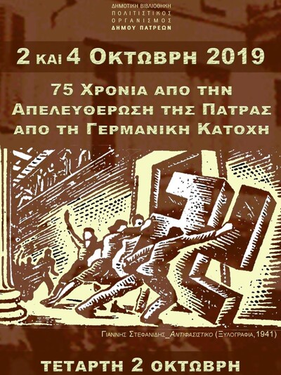 Από τον Πολιτιστικό Οργανισμό του Δήμου Πατρέων γίνεται γνωστό, ότι λόγω των δυσμενών καιρικών συνθηκών που επικρατούν και την Παρασκευή 4 Οκτωβρίου 2019 στην Πάτρα, η εκδήλωση για τον εορτασμό απελευθέρωσης της πόλης από τα Γερμανικά στρατεύματα κατοχής, που ήταν προγραμματισμένη να πραγματοποιηθεί στην πλατεία Γεωργίου στις 8 το βράδυ, θα γίνει την ίδια ώρα, τελικά στον πολυχώρο «Αίγλη» της Veso Mare, στην Ακτή Δυμαίων.
