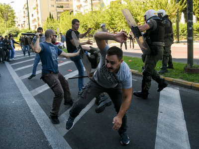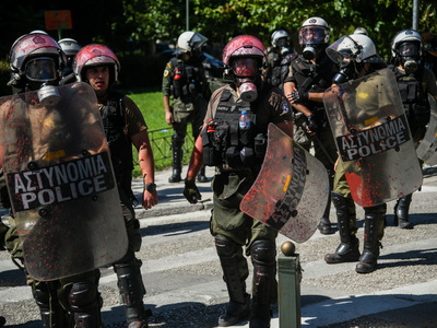 Επεισόδια σημειώθηκαν στο κέντρο της Αθήνας καθώς διαδηλωτές έριξαν μπογιές στο άγαλμα του Χάρι Τρούμαν στην Βασιλέως Κωνσταντίνου.