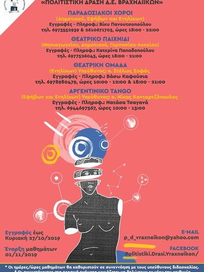 Σε ανακοίνωση της η Πολιτιστική Δράση Δημοτικής Ενότητας Βραχνείκων αναφέρει πως οι δραστηριότητες συνεχίζονται και φέτος και περιμένουν όλους στην παρέα της Πολιτιστικής Δράσης, μικρούς και μεγάλους, παλιούς και νέους μαθητές για μια όμορφη & δημιουργική χρονιά!