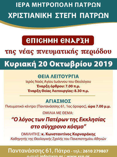 Η Επίσημη έναρξη των χειμερινών δραστηριοτήτων της Χριστιανικής Στέγης Πατρών στην οδό Παντανάσσης μεταξύ της Κορίνθου & της Κανακάρη θα λάβει χώρα την Κυριακή 20 Οκτωβρίου 2019, με την ευλογία του σεβασμιοτάτου Μητροπολίτη Πατρών κ.κ. Χρυσοστόμου.