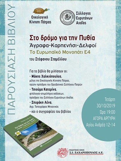 Το νέο βιβλίο του Στέφανου Σταμέλλου, με τίτλο «Στο δρόμο για την Πυθία: Άγραφα – Καρπενήσι – Δελφοί, το Ευρωπαϊκό Μονοπάτι Ε4», θα παρουσιαστεί σε εκδήλωση που συνδιοργανώνουν η Οικολογική Κίνηση Πάτρας και ο Σύλλογος Ευρυτάνων Αχαΐας την Τετάρτη 30 Οκτωβρίου 2019 στις 19.00 στην Αγορά Αργύρη στην Αγ. Ανδρέου και Ζαίμη.