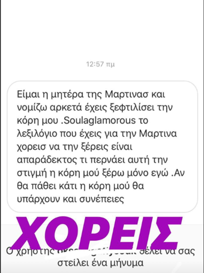 «Είμαι η μητέρα της Μαρτίνας και νομίζω αρκετά έχεις ξεφτιλίσει την κόρη μου. Σούλα Γκλάμουρους το λεξιλόγιό που έχεις για την Μαρτίνα χωρίς να την ξέρεις είναι απαράδεκτο. Τι περνάει αυτή την στιγμή η κόρη μου ξέρω μόνο εγώ. Αν θα πάθει κάτι η κόρη μου θα υπάρχουν και συνέπειες» φαίνεται να γράφει η μητέρα της παίκτριας του GNTM στο μήνυμά της. Η Σούλα Γκλάμουρους δεν παρέλειψε βέβαια να στηλιτεύσει και τα ορθογραφικά λάθη του μηνύματος.