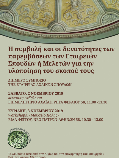 Διήμερο Συμπόσιο της Εταιρείας Αχαϊκών Σπουδών θα πραγματοποιηθεί στην Πάτρα το Σάββατο 2 και την Κυριακή 3 Νοεμβρίου 2019. Η θεματική του Συμποσίου είναι η «Η Συμβολή και οι δυνατότητες των παρεμβάσεων των Εταιρειών Σπουδών ή Μελετών για την υλοποίηση του σκοπού τους που είναι η διατήρηση και ανάδειξη της πολιτιστικής κληρονομιάς.