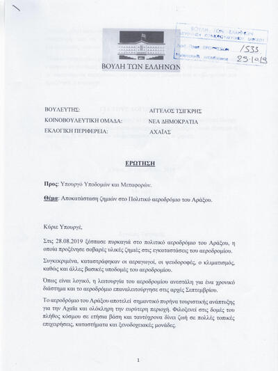Στο πλαίσιο του κοινοβουλευτικού ελέγχου, ο βουλευτής Αχαΐας της ΝΔ Άγγελος Τσιγκρής κατέθεσε ερώτηση προς τον Υπουργό Μεταφορών και Υποδομών Κώστα Καραμανλή, με αφορμή τις ζημίες που προξένησε στις 28.08.2019 η πυρκαγιά στις εγκαταστάσεις του πολιτικού αεροδρομίου του Αράξου.