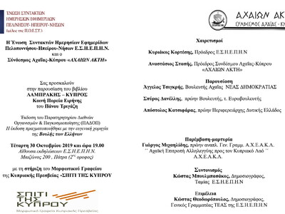 Στην εκδήλωση θα απευθύνουν χαιρετισμούς ο Κυριάκος Κορτέσης, Πρόεδρος Ε.Σ.Η.Ε.Π.Η.Ν και ο Αναστάσιος Στασής, Πρόεδρος Συνδέσμου Αχαΐας-Κύπρου «ΑΧΑΙΩΝ ΑΚΤΗ».