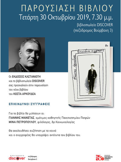 Το βιβλιοπωλείο Discover και οι εκδόσεις «Καστανιώτη» παρουσιάζουν σε εκδήλωση που θα γίνει απόψε Τετάρτη 30 Οκτωβρίου στις 19:30 στο χώρο του βιβλιοπωλείου Discover, πεζόδρομος Βούρβαχη 3 & Κορίνθου, το νέο βιβλίο του Κώστα Αρκουδέα με τίτλο «Επικίνδυνοι συγγραφείς».