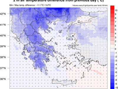Η θερμοκρασία θα παρουσιάσει πτώση κυρίως στα ηπειρωτικά. Η πτώση στα βόρεια θα φτάσει κατά τόπους τους 9 βαθμούς Κελσίου όπως χαρακτηριστικά φαίνεται στο σχετικό χάρτη, που παρουσιάζει τη διαφορά της μέγιστης τιμής της μεταξύ Τετάρτης 30/10 και Πέμπτης 31/10.
