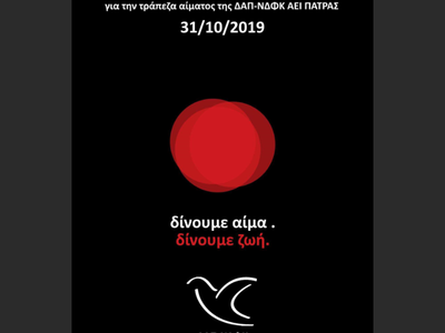 Εθελοντική Αιμοδοσία με κεντρικό σύνθημα «Δίνουμε αίμα. Δίνουμε ζωή» πραγματοποιήθηκε με πρωτοβουλία της παράταξης ΔΑΠ-ΝΔΦΚ ΑΕΙ Πάτρας στο Κτίριο της Πρυτανείας του Πανεπιστημίου Πατρών την Πέμπτη 31/10/2019 από τις 10:30 το πρωί έως τις 13:30 και η συμμετοχή ήταν μεγάλη. Στο χώρο έγινε και συλλογή καπακιών για την αγορά αναπηρικού αμαξίδιου.