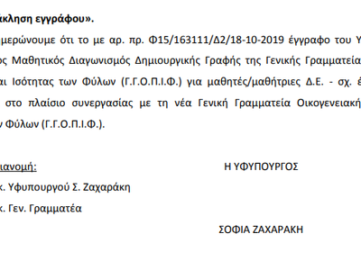 Η Σοφία Ζαχαράκη ανακάλεσε την έγκριση που είχε δώσει πριν μια εβδομάδα το υπουργείο παιδείας για τον πανελλήνιο διαγωνισμό δημιουργικής γραφής των μαθητών με θεμα «Ουπς! Αλλάζω φύλο για μια μέρα!» .