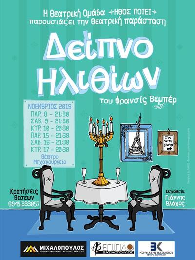Μετά τις επιτυχημένες παραστάσεις του καλοκαιριού στην πλατεία της Λεύκας Πατρών και στο Θεατράκι της Κρήνης, η κωμωδία «Δείπνο Ηλιθίων» του Φρανσίς Βεμπέρ σε σκηνοθεσία Γιάννη Βλάχου, παρουσιάζεται για μια ακόμη φορά, στο κοινό της Πάτρας, τώρα στο θεατρικό πολυχώρο «Μηχανουργείο» (στην οδό Ευμήλου 2 – Όπισθεν Ιερού Ναού Αγίου Ανδρέα).
