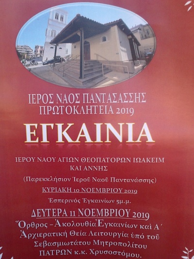 *Να θυμίσουμε πως την Δευτέρα 11 Νοεμβρίου 2019 το πρωί θα τελεστεί η αρχιερατική Θεία λειτουργία στο παρεκκλήσιο της Παντάνασσας που θα εγκαινιαστεί και θα είναι αφιερωμένο στη μνήμη των Αγίων Θεοπατόρων Ιωακείμ και Άννης και θα πανηγυρίζει κάθε έτος στις 9 Σεπτεμβρίου, την επόμενη μέρα του Γενέσιου της Θεοτόκου. Στη Θεία λειτουργία θα χοροστατήσει ο Μητροπολίτης Πατρών κ.κ. Χρυσόστομος. Την προηγούμενη μέρα, την Κυριακή 10/11 στις 5 το απόγευμα θα τελεστεί ο εσπερινός των εγκαινίων.