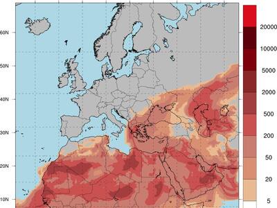 Οι ατμοσφαιρικές συνθήκες ευνοούν τη μεταφορά σημαντικών ποσοτήτων σκόνης από την Αφρική, όπως φαίνεται και στον προγνωστικό χάρτη που ακολουθεί.