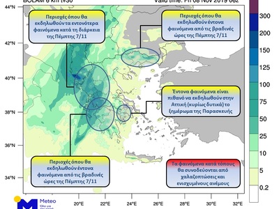 2. Από τις πρώτες πρωινές ώρες της Παρασκευής (08-11-2019) θα επηρεαστεί η ανατολική Πελοπόννησος και βαθμιαία η ανατολική Στερεά (συμπεριλαμβανομένης πιθανώς και της Αττικής), η Εύβοια, η κεντρική και η ανατολική Μακεδονία, η Θράκη, τα νησιά του βορείου Αιγαίου και πιθανώς πρόσκαιρα η Θεσσαλία, οι Κυκλάδες και η δυτική Κρήτη. Σταδιακή εξασθένηση των φαινομένων από το απόγευμα της Παρασκευής