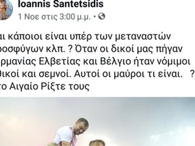 «Τη διαγραφή του κου Σαντετσίδη Ιωάννη του Χαραλάμπους από μέλος της Νέας Δημοκρατίας, καθώς και την απώλεια των δικαιωμάτων και αξιωμάτων που απορρέουν από αυτήν», αποφάσισε ο γραμματέας της Πολιτικής Επιτροπής της Νέας Δημοκρατίας, Γιώργος Στεργίου. Είχε προηγηθεί προκλητική ανάρτηση του κ. Σαντετσίδη, ο οποίος ζητούσε οι μετανάστες να ρίχνονται στο Αιγαίο.