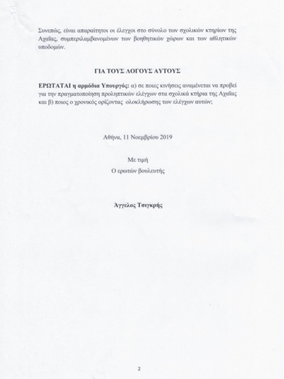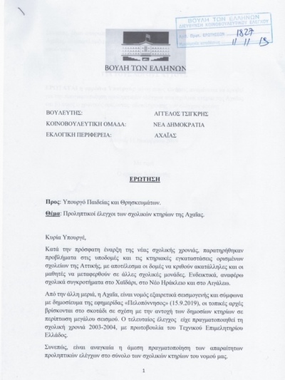 Στο πλαίσιο του κοινοβουλευτικού ελέγχου, ο βουλευτής Αχαΐας της ΝΔ, Άγγελος Τσιγκρής κατέθεσε ερώτηση προς την Υπουργό Παιδείας Νίκη Κεραμέως, με αφορμή την πολυετή απουσία αντισεισμικού ελέγχου των σχολικών κτηρίων της Αχαΐας.