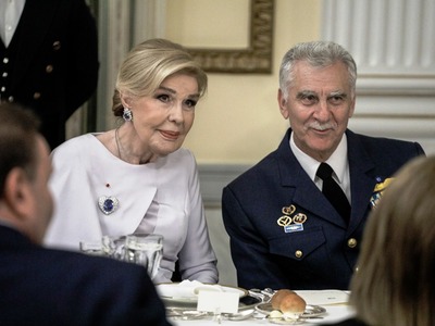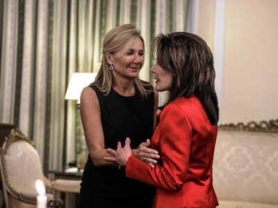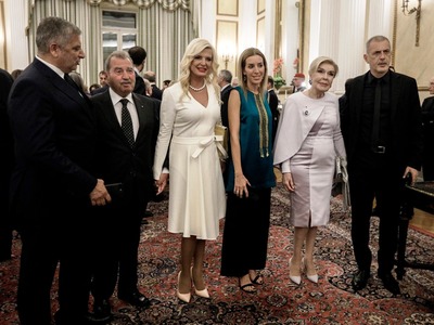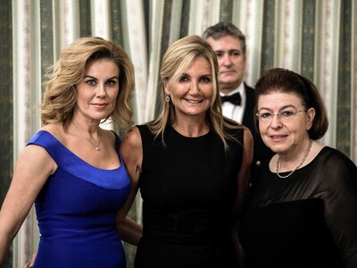 Στα λευκά ντύθηκε η σύζυγος του περιφερειάρχη Αττικής, Γιώργου Πατούλη, Μαρίνα Σταυράκη- Πατούλη, ενώ με μια έξωμη μπλε ρουαγιάλ τουαλέτα εμφανίσθηκε η σύζυγος του υπουργού Ανάπτυξης Αδωνι Γεωργιάδη, Ευγενία Μανωλίδου.