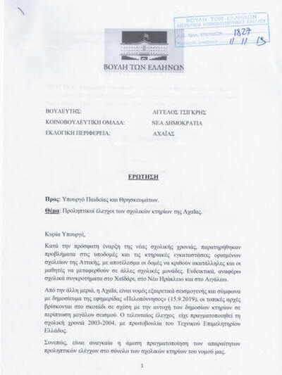 Στο πλαίσιο του κοινοβουλευτικού ελέγχου, ο βουλευτής Αχαΐας της ΝΔ Άγγελος Τσιγκρής κατέθεσε ερώτηση προς την Υπουργό Παιδείας, με αφορμή την πολυετή απουσία αντισεισμικού ελέγχου των σχολικών κτηρίων της Αχαΐας.