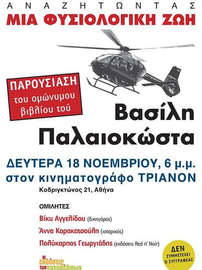Ο εκδοτικός οίκος «Οι Εκδόσεις των Συναδέλφων» διοργανώνει στον κινηματογράφο Τριανόν στην οδό Κοδριγκτώνος και Πατησίων στην Αθήνα την Δευτέρα 18 Νοεμβρίου στις 18:00, εκδήλωση παρουσίασης του βιβλίου του Βασίλη Παλαιοκώστα «Μια Φυσιολογική Ζωή. Δράσεις και αποδράσεις ενός επικηρυγμένου».