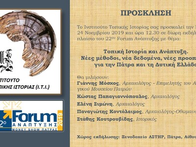 Εκδήλωση του Ινστιτούτου Τοπικής Ιστορίας (Ι.Τ.Ι.) θα γίνει στο ξενοδοχείο Αστήρ στην Πάτρα, την Κυριακή 24-11-2019, στις 12.30 το μεσημέρι, στο πλαίσιο του 22ου Φόρουμ Ανάπτυξης – Monet Show Patras. Τίτλος της εκδήλωσης είναι: "Τοπική Ιστορία και Ανάπτυξη. Νέες μέθοδοι, νέα δεδομένα, νέες προοπτικές για την Πάτρα και τη Δυτική Ελλάδα".