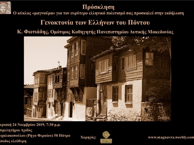 Ο κύκλος «μαγναύρα» για τον ευρύτερο ελληνικό πολιτισμό διοργανώνει εκδήλωση με θέμα «Γενοκτονία των Ελλήνων του Πόντου» με προσκεκλημένο ομιλητή τον Ομότιμο Καθηγητή Κωνσταντίνο Φωτιάδη από το Πανεπιστήμιο Δυτικής Μακεδονίας.